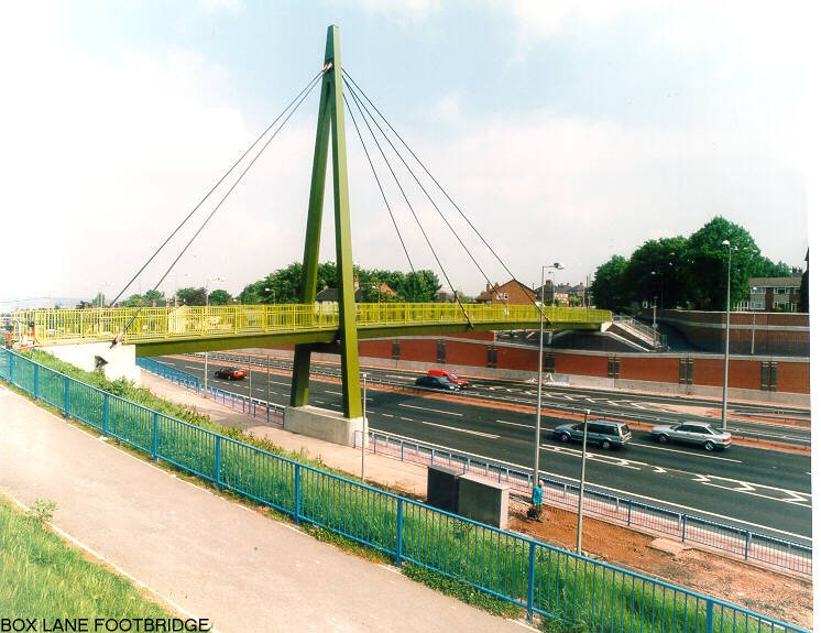 Box Lane Footbridge. Over the A50 in Stoke. Only cable-stayed bridge I have ever been involved with. Quite neat (not my choice of colour though). I think the only cable-stayed bridge around which uses carbon fibre cables instead of steel.