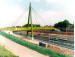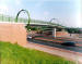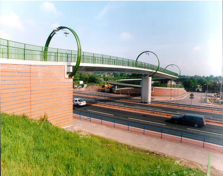 More from the A50 in Stoke (lot of input to that job). George Avenue Footbridge. Nothing special I suppose, unless you get off on (more) red/blue bricks and green painted steelwork, with huge steel loopy lighting things. Satisfaction though in working out all the details to bring the whole structure together and making a neat looking structure. I remember spending hours on the geometry, tying in the spiral ramp into the rest of the bridge (and into Stoke). This was pre-spreadsheet days - now I could do it in a fraction of the time and have it drawn out in 3-D in an instant. Which is better? Well, at least I know I can do such things without solid state electricity (and, thank God, without Microsoft). I still have (somewhere) a slide rule and a book of log tables! (Secretly prays he never has to resort to them again!)