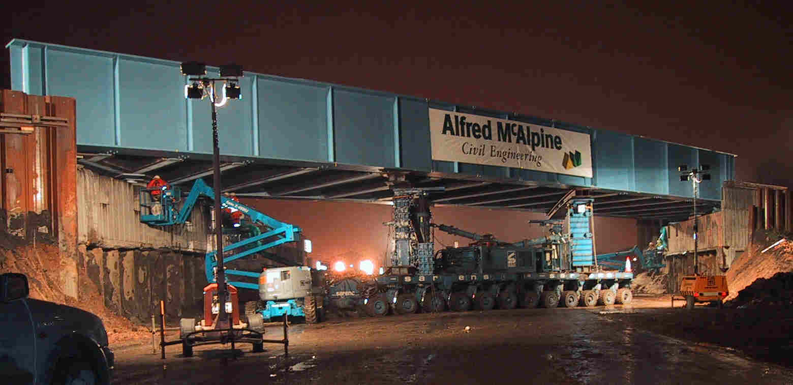 Delhi Street Railway Bridge. The following words are not mine, but paraphrased from Scott Wilson's website. "...... the delicate operation of removing an aging Victorian bridge that has provided a rail link to the docks for more than 100 years and its replacement by a newly constructed bridge. The bridge is a major feature of the £42million A1033 Hedon Road Scheme in Hull. This bridge is a 38m skew span steel through girder construction and the deck weight is approximately 600 tonnes. Scott Wilson Designer’s Site Representative said, “We watched fingers crossed as the bridge was lowered into place. It is a real team effort that has made this project work. There were several constraints that provided us with technical (design) problems such as difficult ground conditions, the necessity for minimum deck construction to comply with headroom requirements and the actual building of such a superstructure during a weekend closure to ensure minimum disruption to the operation of the railway line in and out of the port. This was why the new bridge was constructed adjacent to the old bridge and then lifted into place.” The erection process started at 6.30pm on Friday evening when the road under the Delhi Street Bridge was closed and terminated with the successful opening of the road again on Monday morning at 6am. The operation involved jacking up the existing railway bridge deck away from its supports, lifting it into the air and rotating it 90° before transporting it more than 200 metres to a temporary area adjacent to the new deck. The new superstructure had already been jacked some 3.8 metres into the air to allow the transporter to be positioned beneath it. The new bridge was carried by the transporter to the bridge site at a rate of 2 metres a minute. During the transport operation the old bridge abutments were demolished and the new abutments exposed. Again the bridge deck was rotated 90 degrees and lifted some 8 metres prior to being lowered into its final position on the new abutments. The transporter then moved away from the bridge allowing the bridge bearings to be grouted and the remaining portion of the old bridge to be demolished." Well hurrah for us!